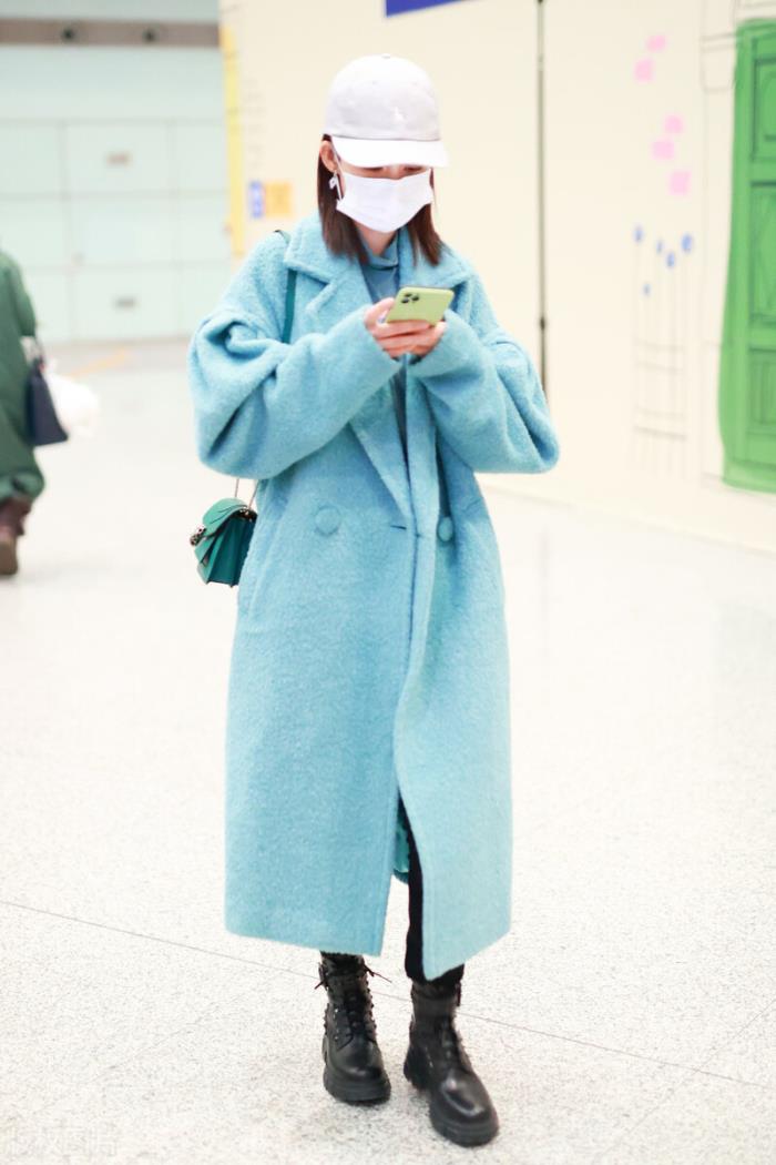 身穿蓝色羊绒大衣,内搭也是同色系,这样的搭配很显清冷气质。