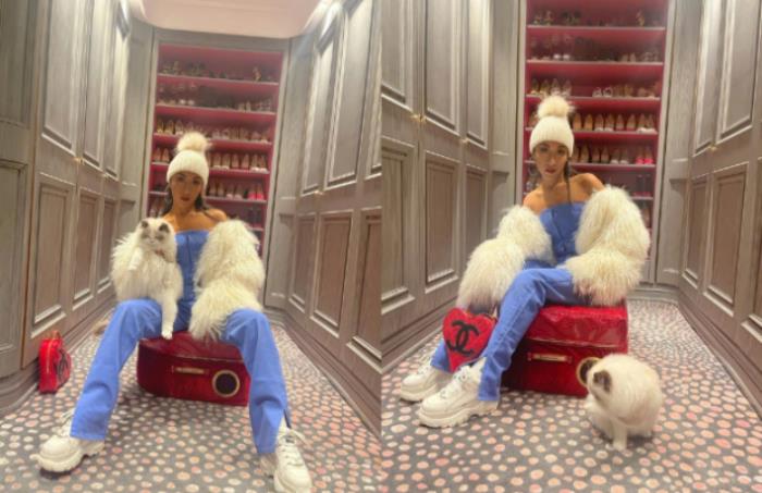 比如穿衣打扮,吉克隽逸喜欢在外人眼里偏浮夸的造型,有点富贵花的意思。上个月她分享了一套家中造型,抹胸牛仔上衣配白色皮草,以及夸张的耳环。一身搭配让她看起酷劲十足,同时浑身又写着“有钱人”三个大字。