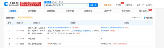 据天眼查APP显示,近日,海南谦星电子商务有限公司发生工商变更,薇娅关联公司杭州谦道电子商务有限公司退出投资人行列,新增徐相材。