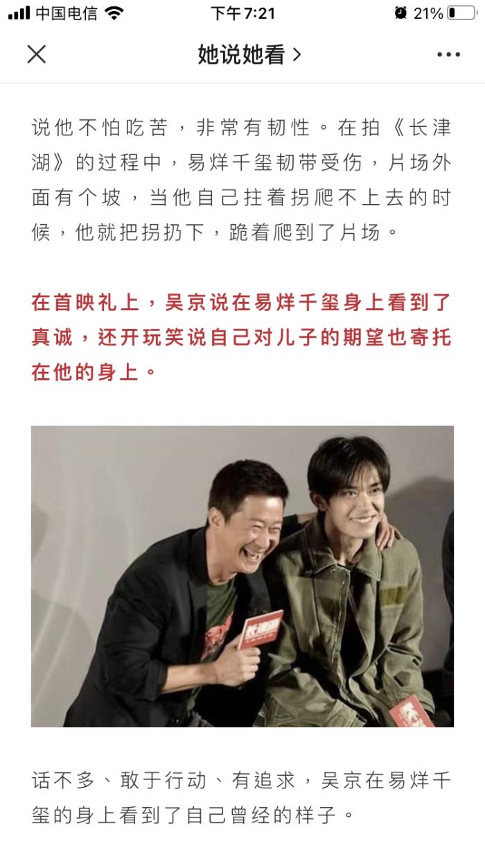 《长津湖》热映后,各类评论蜂拥而至!微信公众号《她说她看》上推出许灵官的一篇评论文章《易烊千玺!谢谢你救了吴京!》,以专业观影者的角度,对影片进行了评析,并对易烊千玺的演技进行了深度剖析!因为文章太长,我们就看一些精彩的部分: