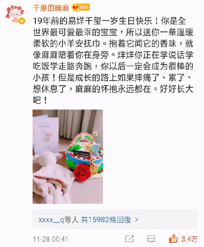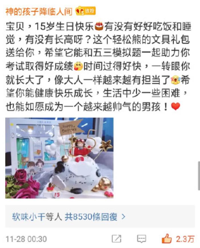 在易烊千玺生日动态的下方,最浪漫的莫过于粉丝的评论了。他们以穿越时空的视角为自己的偶像庆生,从一岁到19岁,根据不同的年龄段配以贴合的文字, 而且配图也精心准备,有口水巾,识图卡片,毛笔,陶泥工具,望远镜等等。