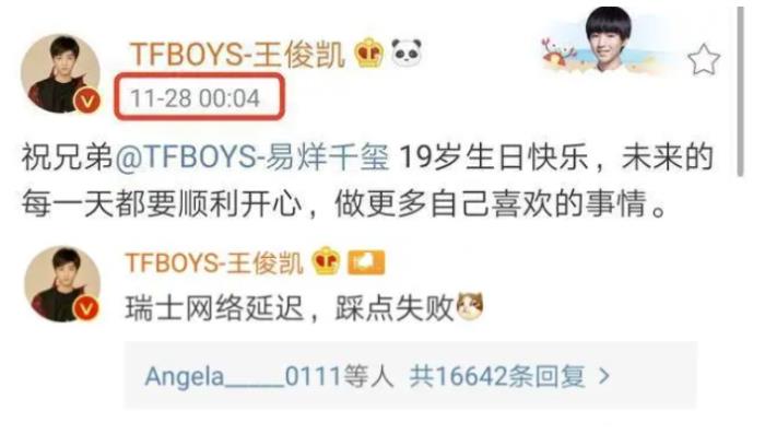 王俊凯对于踩点庆生,可是有前科的。去年易烊千玺19岁生日时,王俊凯踩点失败,晚了4分钟才发出动态,当时解释是因为在瑞士有网络延迟,不知这次原因是什么呢?