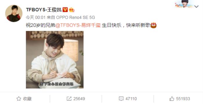 11月28日,是易烊千玺的20岁生日,凌晨刚到,好兄弟王俊凯和王源纷纷踩点为其庆生,还不忘为其宣传新歌。