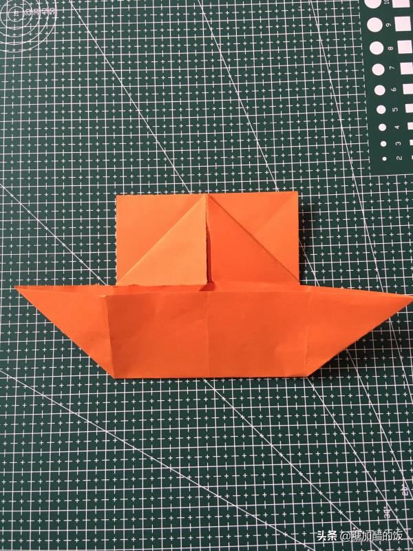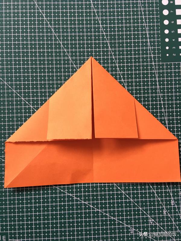 5.接着把梯形部分对折三次,展开,折出层次。再把上面方形部分如图所示折出形状。