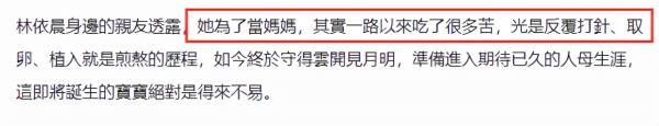 台媒称,据林依晨身边的亲友透露,为了当妈妈她吃了很多苦,光是反复打取卵针就是很煎熬的过程,如今她终于成功当上妈妈,确实是非常不易。