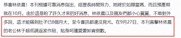 据悉,林依晨为了怀孕非常辛苦,这次好不容易怀上亲友们都对此消息选择保密,才让她能够瞒到肚子8个月大。