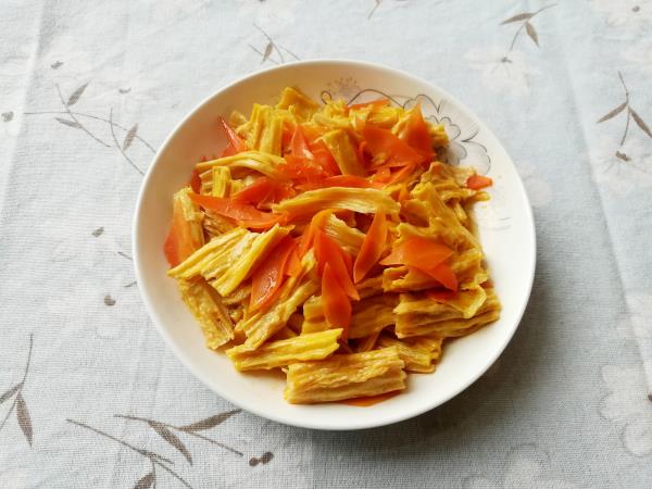 【胡萝卜炒腐竹】食材:腐竹,胡萝卜。看到这个菜有点哭笑不得,不过颜色搭配得挺好,红的胡萝卜,黄的腐竹,暖色调看着更有食欲。对于没做过几次饭的人来说,已经不错了。