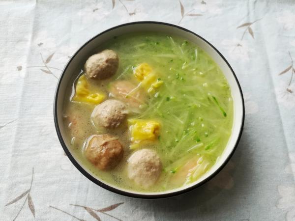 【青皮萝卜丸子汤】食材:各种火锅丸子,青皮萝卜。火锅丸子是头一天吃火锅剩下没煮的,青皮萝卜是买来当水果吃的,没想到我家先生能用来煮汤。这碗汤整体来说味道还不错,煮出来的萝卜汤挺鲜的,要是不放油,清爽一点就更好了。
