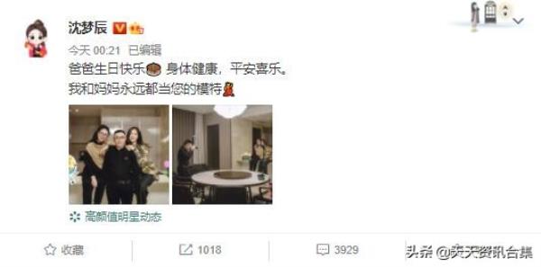 8月27日00:21分湖南卫视主持人沈梦辰在社交平台为其父亲庆生,配有一家三口的两张照片并配文:爸爸生日快乐,身体健康,平安喜乐。我和妈妈永远都当您的模特。沈梦辰的祝福语很接地气,像平常女儿家一样,愿父亲的身体安康,开心快乐。没有什么比家更温暖、没有什么比亲情更珍贵。