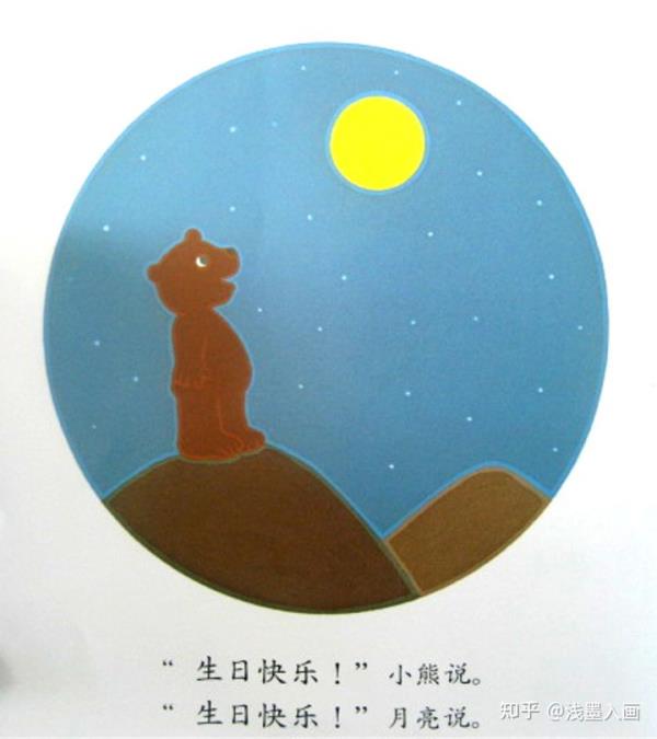 绘本描述了小熊想给月亮送给生日礼物,它主动接近月亮,最后以为山谷里的回声是月亮在回应它,它兴高采烈买了一顶帽子送给月亮,结果,第二天,它居然也收到了月亮送给他的帽子。这是怎么一回事呢?