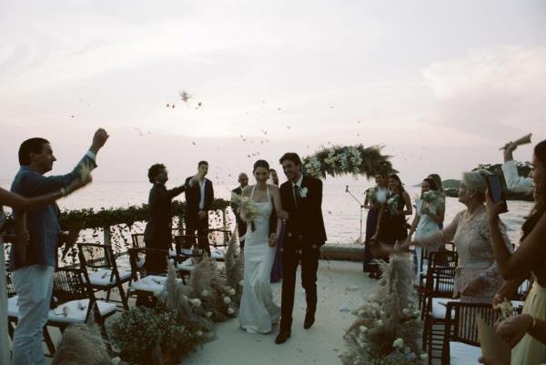 当天两位新人在海边举行婚礼,22岁的梅朵穿着一身洁白的婚纱和宾客交流,满脸都是幸福的笑容。范·迪塞尔则穿着一身蓝色西装帅气现身,他身材健硕魁梧,很有男人气概,站在梅朵身边像是保护妹妹的大哥。
