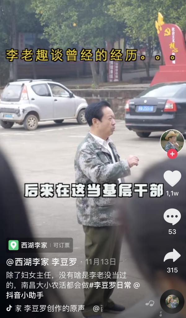 在江西省南昌市周围的西湖李家村,李豆罗是村里最大的明星。曾经他是江西省南昌市的市长,退休后回到农村,被江西电视台的年轻人请来拍抖音,宣传南昌物产。