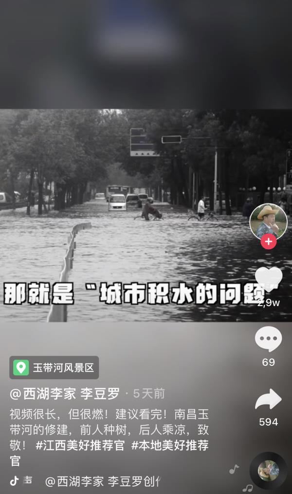 我现在想到两个方向,要利用起抖音这个全新渠道。一个是和部门合作,一起宣传反诈骗之类的事情。另一个我可以谈谈南昌市以前的城市发展,讲讲咱们的城市是怎么建设起来的,我前两天发了个玉带河,谈南昌的水治理问题,一下子百多万人点赞。