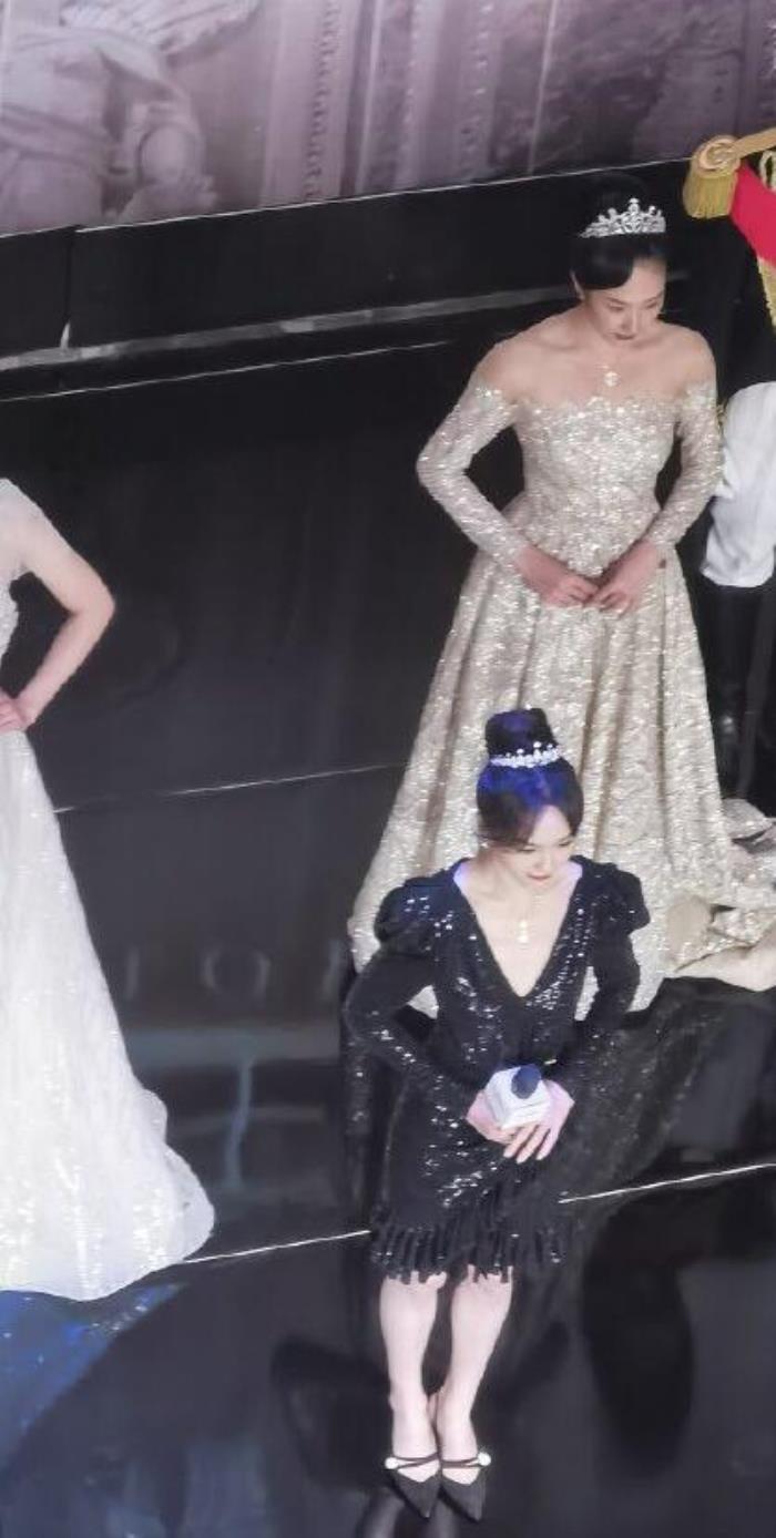 唐嫣身后的“公主”都穿着白色的连衣裙,应该是为了衬托作为今天主角的她了。唐嫣今天盘着长发,戴上了钻石皇冠,她的脖子上手上以及耳朵上都佩戴了钻石饰品,在灯光的照耀下更显贵气十足。