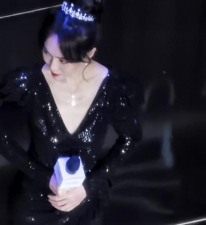 唐嫣妆容精致,一抹红唇非常吸睛,充满了成熟女性的魅力。她今天穿着黑色深V亮片连衣裙,给人感觉优雅高贵,仿佛是现实版的“黑天鹅”。