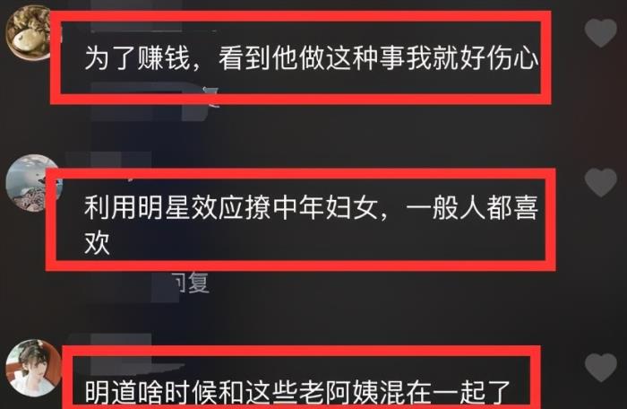 看到明道的这些行为,网友纷纷吐槽:“为了赚钱,看他他做这种事就好伤心”,“利用明星效应撩中年妇女”,“明道啥时候和这些老阿姨混在一起了”,“掉价了,好尴尬”,“为什么要降低自己的档次”,“明道现在成了交际花”,“配合她们拍照,有点心酸”,“瞬间无感,怎么变成这样了”,“可怜的明道”,“明道:你们一个个中年妇女,老让我闻你们的头油”。