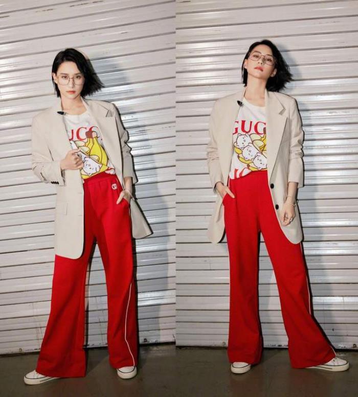 杏色休闲西装+红色高腰阔腿裤: