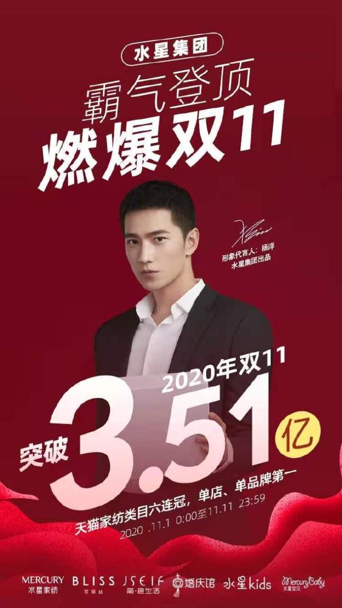 今日,杨洋代言的品牌水星家纺官博发布双十一收官战报,2020年11月1日0点至11月11日23点59分期间,水星家纺业绩突破3.51亿元,荣获天猫家纺类目六连冠,单店、单品牌第一!霸气登顶,燃爆双十一,杨洋品牌小福星认证!