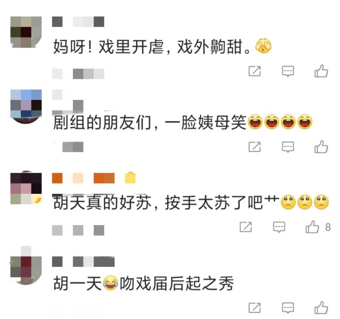 这段视频被发布在网络上之后,很快引发了大众的关注与热议。有网友表示"天呐!戏里开虐,戏外齁甜",有网友留言称"剧组的朋友,一脸姨母笑",有网友评论"胡一天真的好苏",也有网友调侃称"胡一天,吻戏届后起之秀"。