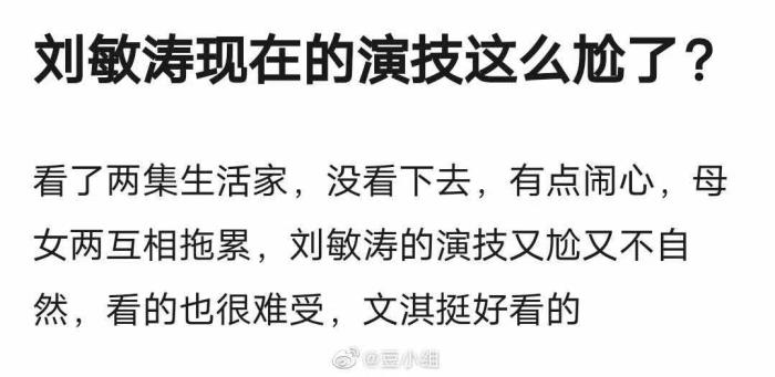 《生活家》开播,没想到被嘲的竟然是刘敏涛的演技。有网友用了12个字来形容她,挤眉弄眼、表情做作、莫名其妙。
