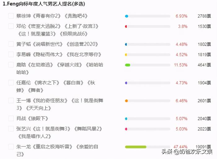 这次年度的榜单又开始了,能够上提名的算是现在顶流明星的最强一批了。看看图片理由都谁,并且有多少票数吧,看图片: