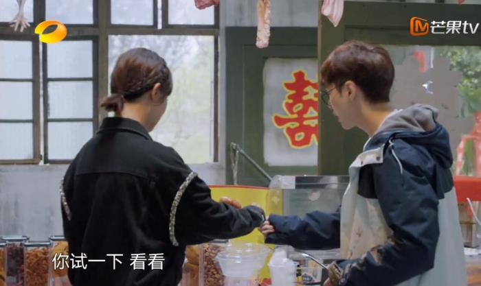 当一家人到达仓库的时候,张艺兴主动叫杨紫进去给她拿烤肠吃。