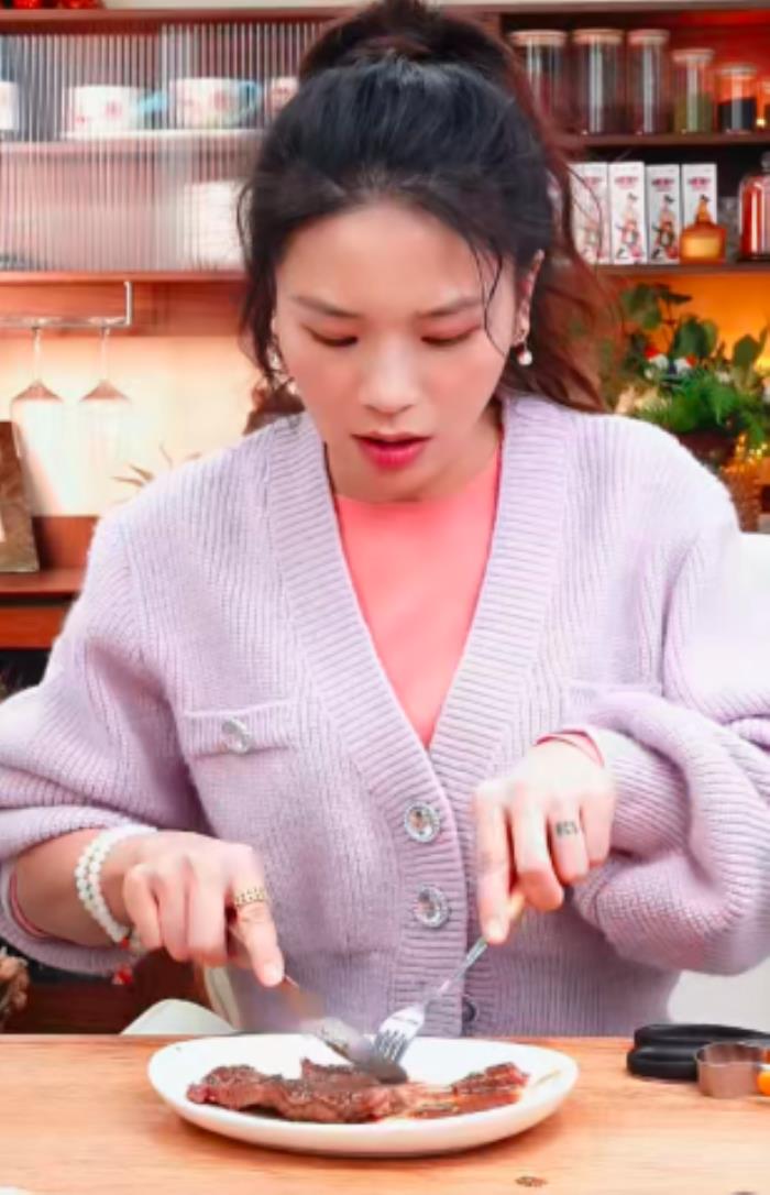而在牛排煎好之后,直播室的助手们也争相恐后地吵着要吃,黄英自己只吃了小小的一块,然后耐心地切好全部分给了大家,完全没有丝毫的明星架子。