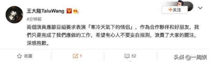 看得出来,王大陆也道过歉,澄清了,是节目组要求表演寒冷的情侣,所以自己才会那么演绎。
