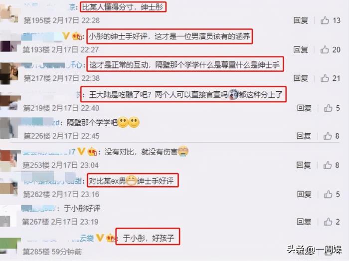 不少网友都纷纷发表了自己的看法:于小彤好孩子。对比某EX男,绅士手好评。隔壁那个学学吧。王大陆是吃醋了吧,两个人可以直接官宣吗,都这种分上了。没有对比,就没有伤害。比某人懂得分寸,绅士彤。这才是正常的互动,隔壁那个学学什么是尊重,什么是绅士手。小彤的绅士手好评,这才是一位男演员该有的涵养。