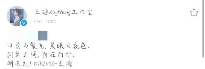 11月1日,王源工作室在社交平台发布了一段文字并搭配了一张名为"朝暮"的海报。其中有一个十分引人注意的点,在海报的正下方写有"11.08"的字样,众所周知11月8日是王源的生日,那么联想到工作室发布的这张海报,是不是就意味着王源的二十岁生日会要来了呢?
