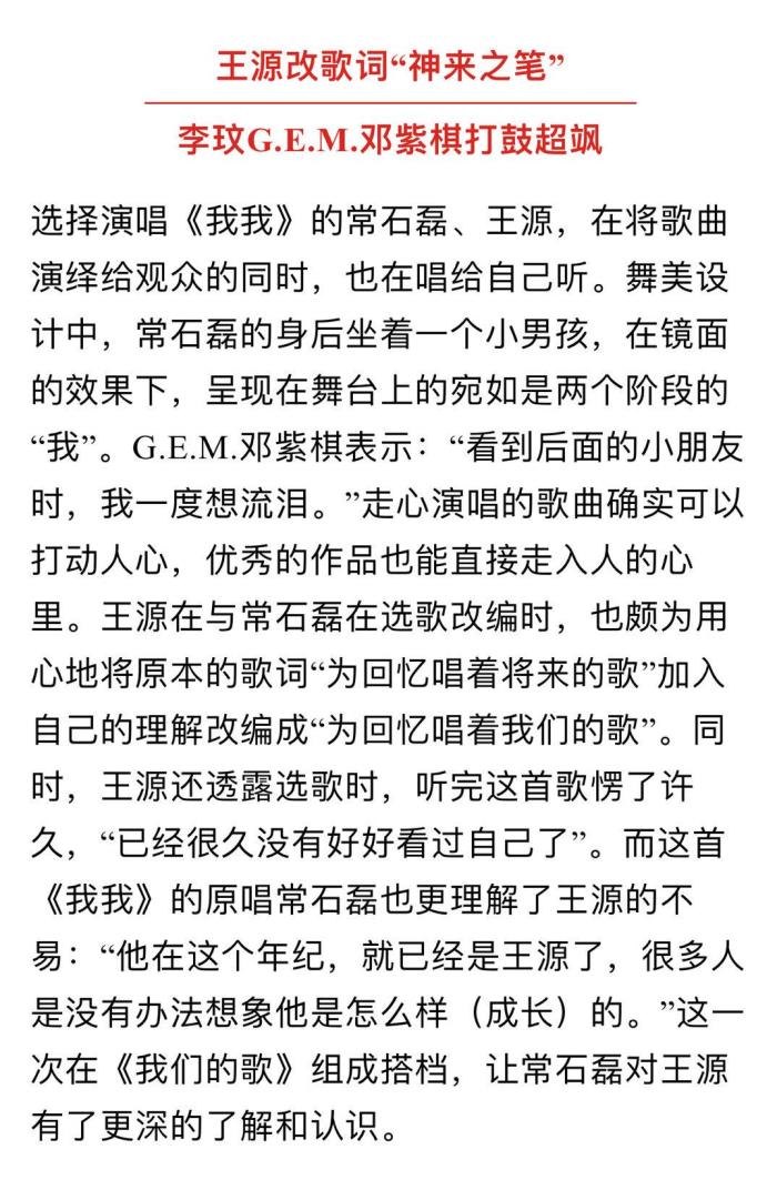只是,看到她说的王源在十九岁唱《我我》,很多人表示不知道这个消息。其实,《我我》就是王源即将在今晚播出的《我们的歌》节目中演唱的歌曲,这首歌的原唱就是王源现在的"新搭档"常石磊,据说二人做了歌词改编,舞台设计也很有新意,将会带来一个非常令人难忘的舞台。很多粉丝表示已经准备好纸巾了。那么,大家就请期待王源在今晚的表演吧!