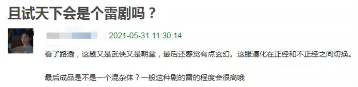 其实,古装剧露大腿也不是那么不可理喻,只要剧情衔接连贯就行,就如同陈芊芊造型,跟武侠片设定很契合,没人会觉得奇怪。《且试天下》造型饱受质疑,也是操作太多,希望剧组还是对造型认真一点吧。
