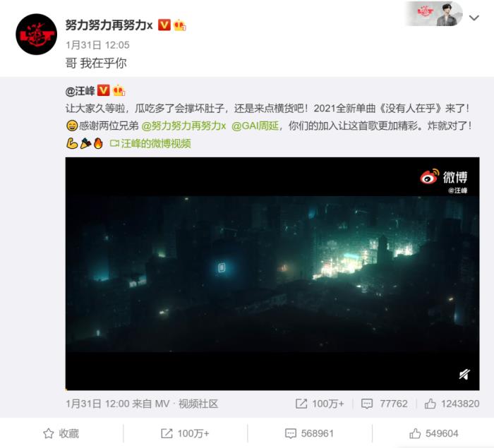 本来接二连三的娱乐圈大事件的爆出就为这首歌添了不少热度,张艺兴作为流量担当的偶像艺人亲自发博“哥,我在乎你”让这首歌的热度更上一层。