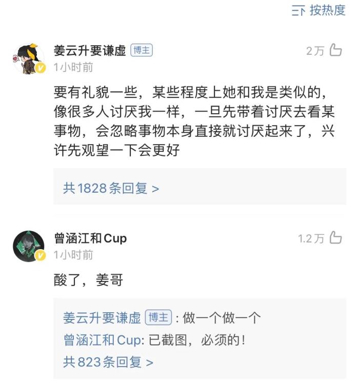 此微博一经发出,姜云升微博热评中大量铁粉直言:“喜欢姜云升,但并不妨碍我讨厌鞠婧祎。”