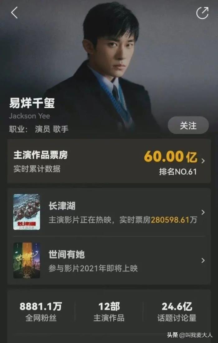 如今,易烊千玺主演电影票房破60亿,即将成为娱乐圈里面最年轻的百亿影帝。