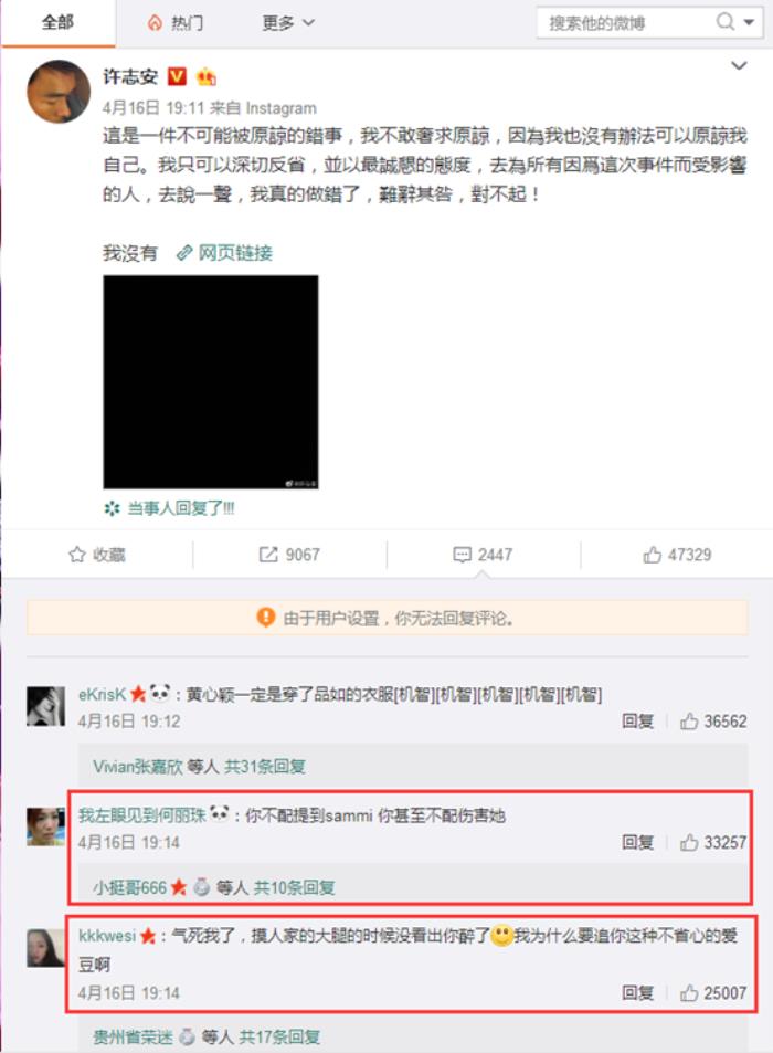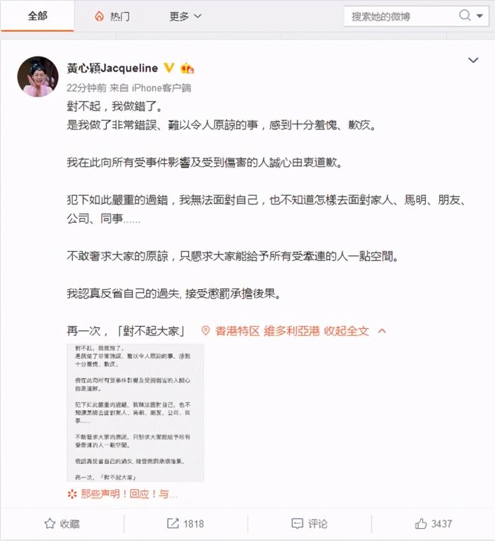 至于黄心颖也好不到哪儿去。事情曝光后,黄心颖被封杀,她还在微博上发文道歉。