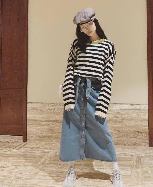 蒋淑英的这种风格也和上面的风格一样偏向日系复古风格。黑白条纹毛衣在领口处加入鳄梨色对比设计,不仅丰富了款式的配色,也让整体风格看起来更加明亮清新。蒋淑英选择了下半身充满复古文艺气息的牛仔半身裙,贝雷帽和框架眼镜也是搭配亮点。