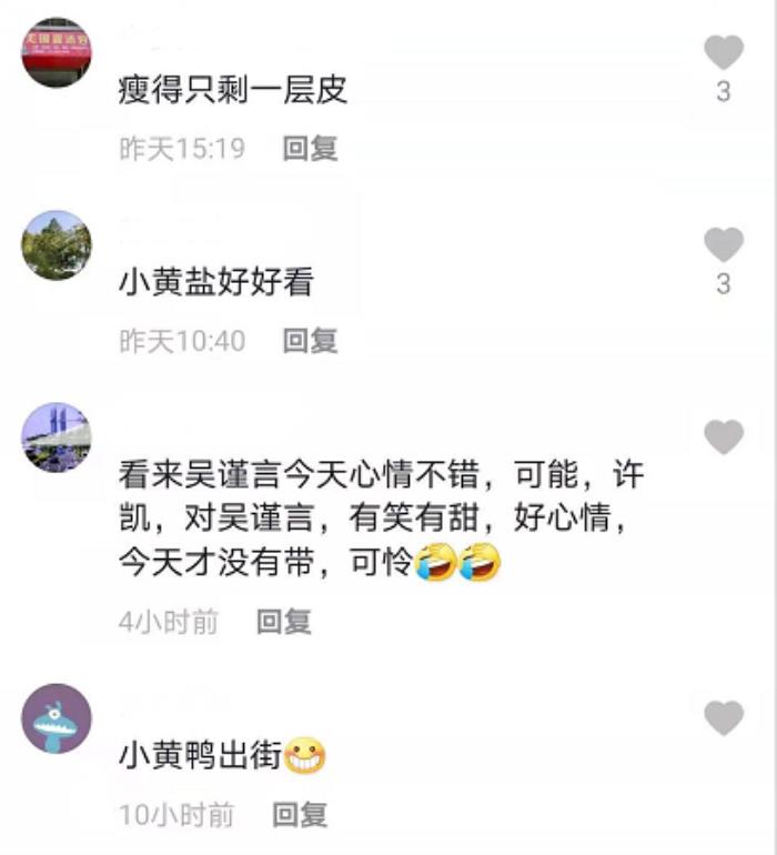 随着视频的发出,也有不少网友留言:"小黄鸭出街"、"看来吴谨言今天心情不错......",但整个人衣宽带松,娇小玲珑,显得非常消瘦,还有网友表示:"瘦的只剩下一层皮",虽说这位网友的表述略微有些夸张,但吴谨言确实很瘦。