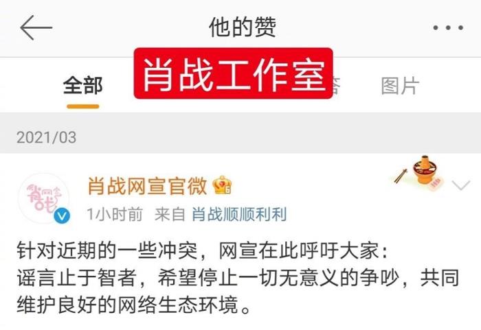 之后大家也发现,肖战的工作室点赞了网宣组号召粉丝休战的这条微博,从这也能感觉到肖战团队现在对于网络舆论和粉丝处理这块挺小心谨慎的,很怕重蹈去年的覆辙,每次一有苗头,都第一时间出来约束引导粉丝,不让事态扩大,引起不必要的负面影响。