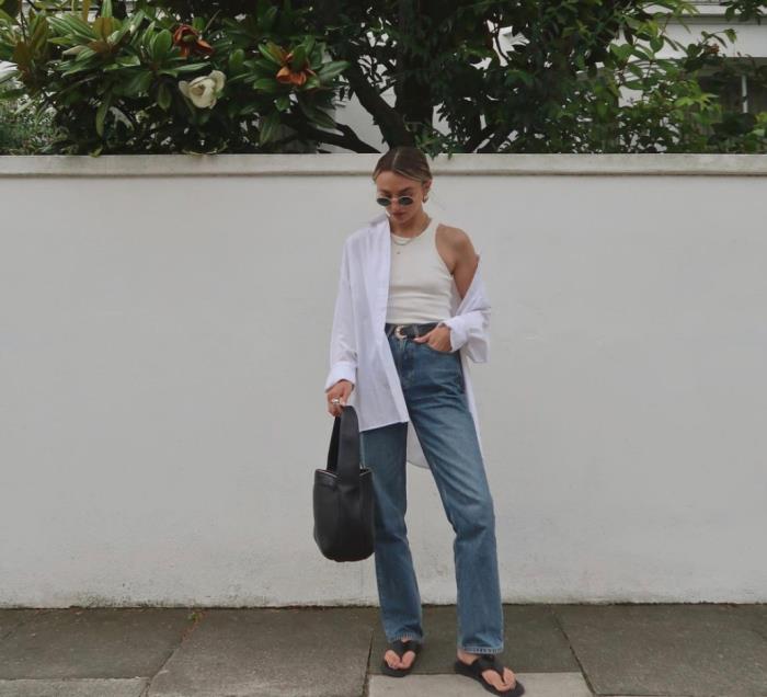 下图时装博主的穿搭就是很好的例子,清爽的白衬衫加上显瘦的小背心和休闲风牛仔裤,看似简约日常的单品,因为穿着时注意身材比例,整体搭配在一起不但风格鲜明也很有修饰作用。