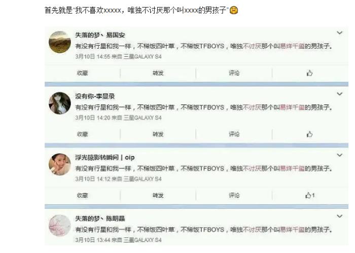 这件多年前的事情被曝出来后,下面的评论满满的都是为易烊千玺打call的,但是所有的评论太水军了,满满50页的评论内容几乎一样:“有没有行星和我一样,不喜欢四叶草,不喜欢TEBOYS,唯独不讨厌那个叫易烊千玺的男孩。”这有点太明显了吧,即便是易烊千玺的粉想要为他打抱不平,多少也换换内容也行呀。而且,这已经是多年前的事情了,没必要这么当真!