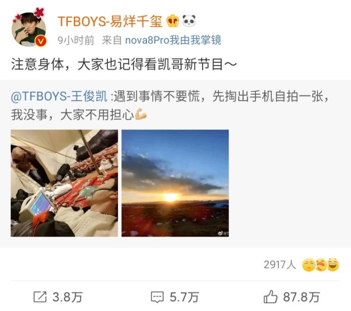 《恰好是少年》上线后,大家看到了王俊凯在旅行中强烈的高原反应,为此心疼不已,王俊凯发出了当初的自拍,给大家报了平安,随后王源和易烊千玺转发了这条消息。