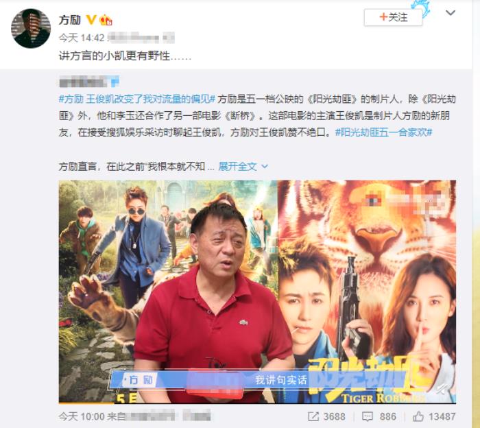 对于王俊凯的盛赞,方励也绝非是说场面话,而是合作之后的有感而发。最近王俊凯和马思纯主演的电影《断·桥》就是方励编剧并担任制片人的电影,方励也是看过王俊凯在电影中的表现之后才说出了这番话。