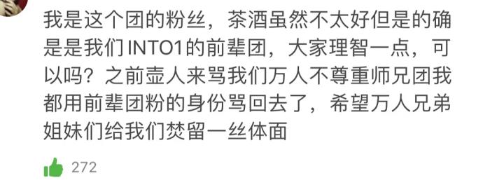 在INTO1粉丝口中,肖战和毛不易似乎都被INTO1粉丝“些许嫌弃”,并表示INTO1粉丝会尊重师哥,毕竟师哥还要赚钱养公司,这语气像是大爷一般,令网友们十分愤怒。虽说这一个人的言论无法代表一群人,但显然不止一个INTO1粉丝这么认为——