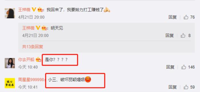翻看王梓薇最后一条微博评论区,也有网友频频追问她是不是小三。