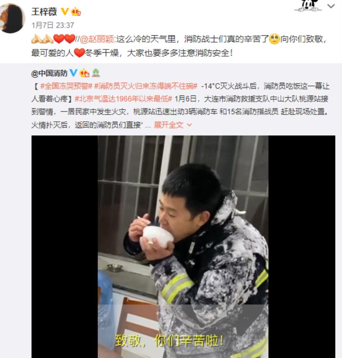 字里行间不难看出,王梓薇确实是被冤枉的。事实上,王梓薇和赵丽颖在《知否知否应是绿肥红瘦》戏中关系亲密,戏外也有互动,早在今年1月7日,她还转发了赵丽颖为消防战士打call的动态。