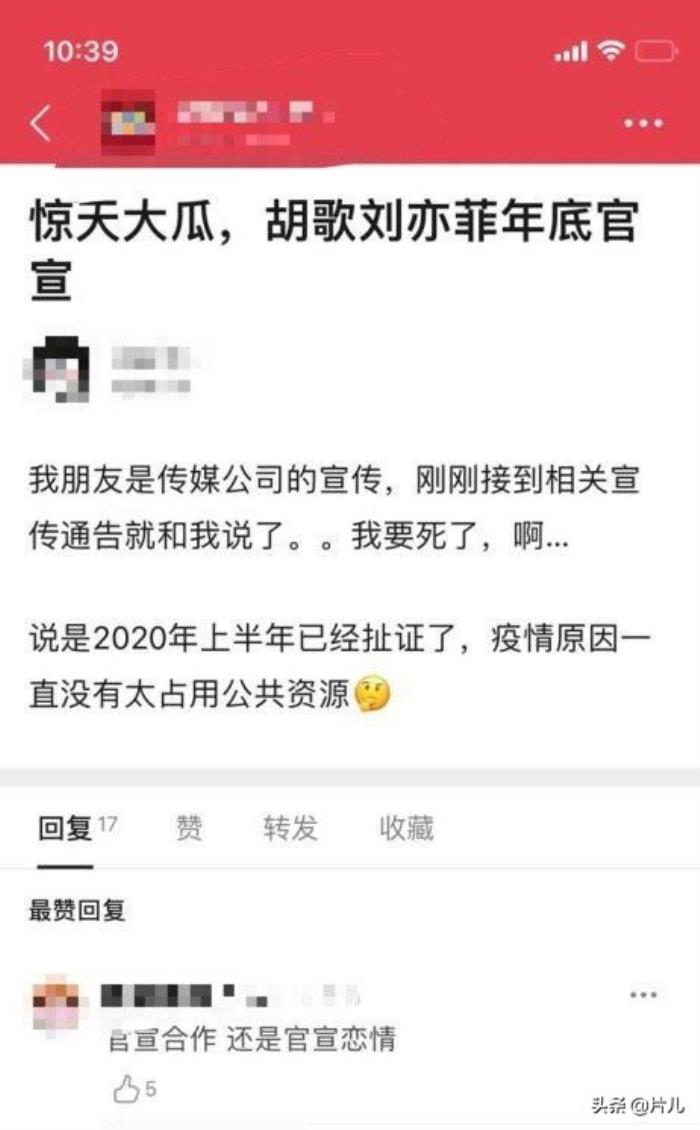2月4日,突然网曝胡歌和刘亦菲已经领证结婚。有网友在社交平台上发文称,两人在2020年上半年便已经领证,但是由于疫情原因两人一直没有对外官宣。随后,有网友询问“官宣合作,还是官宣恋情”,但是曝出此消息的网友并没有确切回复。