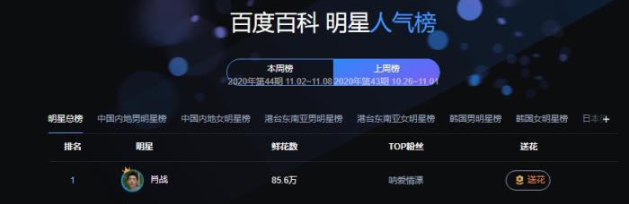 今日,2020年第43期百度百科明星人气榜周榜(2020.10.26~11.01)公开,恭喜肖战再登顶百科明星人气榜周榜总榜与内地男明星双榜top1!期待待播剧《余生请多指教》《斗罗大陆》《狼殿下》顾魏、唐三和疾冲!