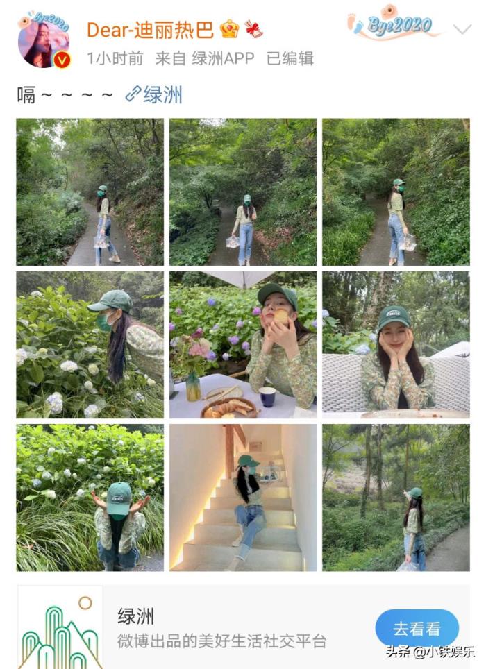 7月10日,迪丽热巴微博晒出一组田园绿洲九宫格照片,照片里,迪丽热巴身穿花外套加牛仔裤,清新自然,宛如丛林里的精灵美女。