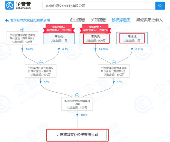 和颂传媒实际控制人为李冰冰的妹妹李秀秀(后改名李雪),估计这个李雪就是李冬雪,也是李冰冰的经纪人,持股比例99.89%,另外的0.11%为李冰冰持有。